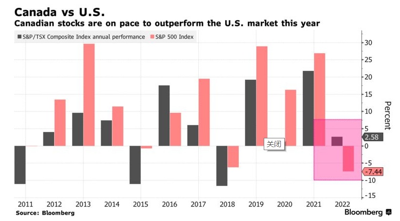 由于油气公司和矿业公司占主要股指成分的近三分之一,加拿大股指的表现优于美国股指,标准普尔/多伦多证交所综合指数今年上涨2.6%,而标准普尔500指数则下跌逾7%。此外,随着加拿大央行和美联储上调利率,并暗示还将进一步加息。银行股今年的行情也出现上涨。据了解,银行股在标准普尔/多伦多证交所综合指数中所占的比重为33%。