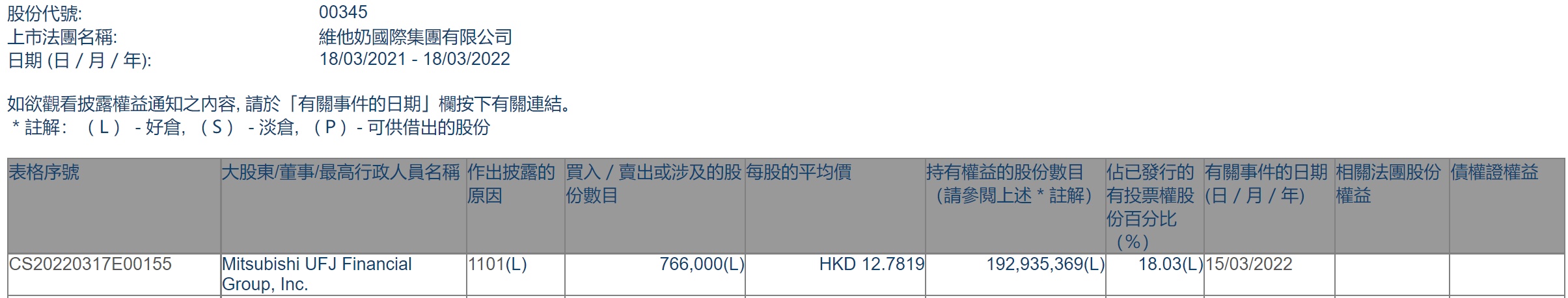 智通财经APP获悉,香港联交所最新资料显示,3月15日,三菱日联金融增持维他奶(00345)76.6万股,每股作价12.7819港元,总金额约979.09万港元。增持后最新持股数目约为1.93亿股,最新持股比例为18.03%。
