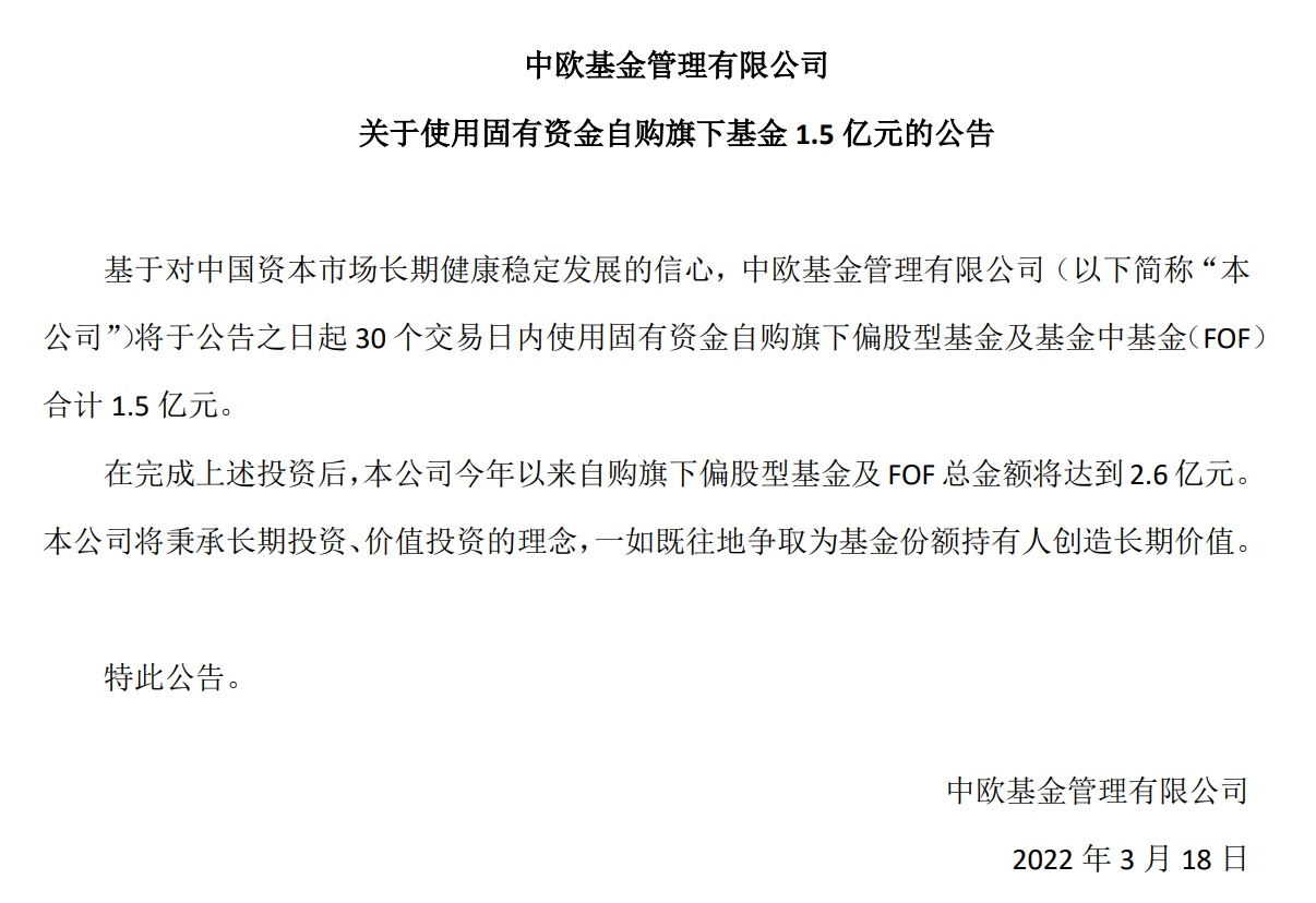 智通财经APP获悉,3月18日,中欧基金发布公告称,基于对中国资本市场长期健康稳定发展的信心,中欧基金将于公告之日起30个交易日内使用固有资金自购旗下偏股型基金及基金中基金(FOF)合计1.5亿元。