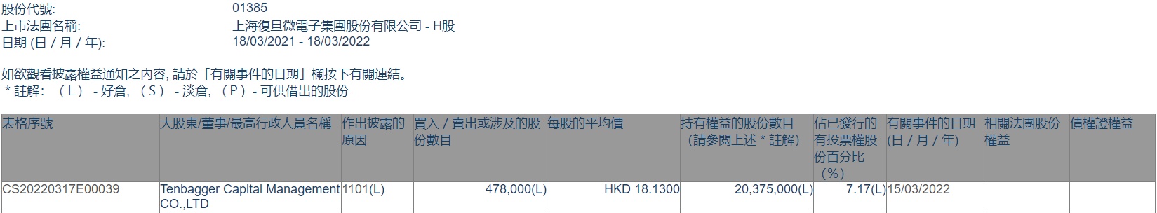 智通财经APP获悉,香港联交所最新资料显示,3月15日,Tenbagger Capital Management增持上海复旦(01385)47.8万股,每股作价18.13港元,总金额约为866.61万港元。增持后最新持股数目约为2037.5万股,最新持股比例为7.17%。