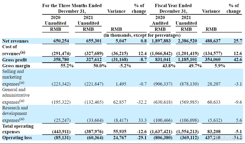 达内教育Q4季度的经营亏损降至6036万元,减亏幅度为29.1%,经营亏损率由2020年同期的13.1%,下降3.9个百分点至9.2%。2021年全年,达内教育经营亏损从2020年的8.06亿元,降至3.69亿元,同比大幅下降54.2%。经营亏损率同比2020年的42.5%大幅收窄至2021年的15.5%。