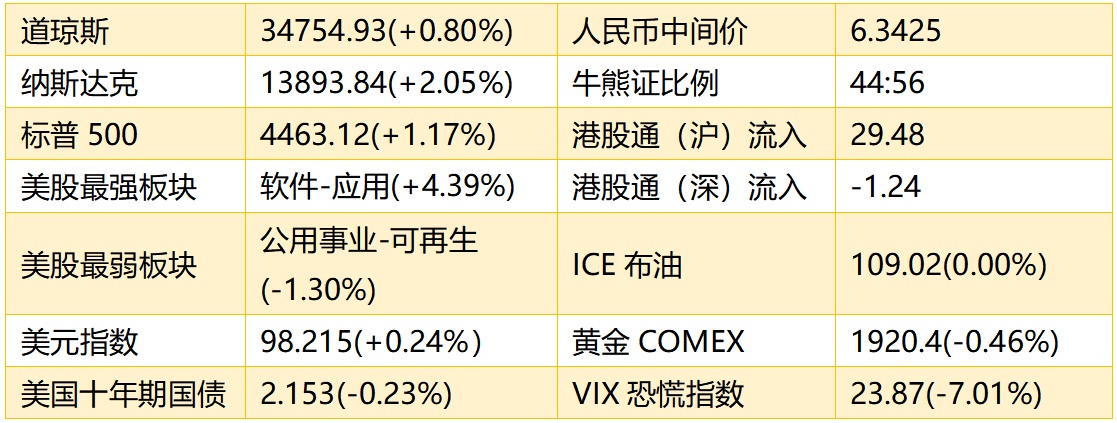 1.截至上周五美股收盘,道指涨274.17点,涨幅为0.80%,报34754.93点;纳指涨279.06点,涨幅为2.05%,报13893.84点;标普500指数涨51.45点,涨幅为1.17%,报4463.12点。纳斯达克中国金龙指数大涨7.50%。港股ADR指数大涨,按比例计算,收报22016点,较香港收市涨603.96点或2.74%。