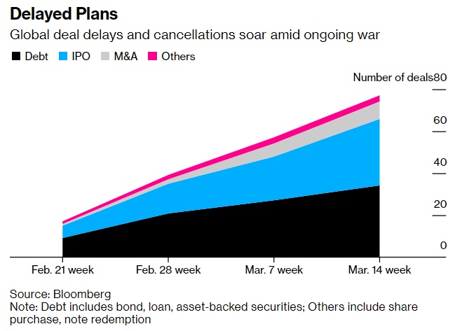 电动汽车巨头特斯拉(TSLA.US)是最近一家取消融资计划的知名公司。该公司上周推迟了一次10亿美元的汽车租赁债券发行。自一个月前俄乌冲突升级以来,已有近80家公司(近一半来自美国)搁置了至少250亿美元的交易。