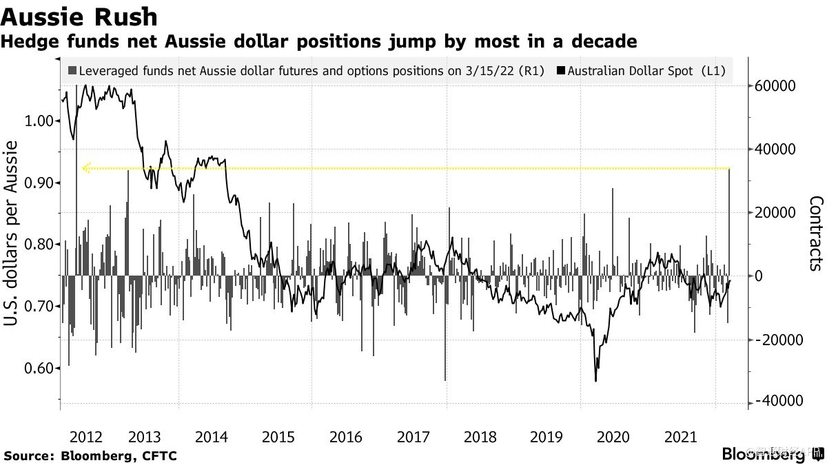 澳元是对风险情绪波动最敏感的宏观资产之一。这些对冲基金错误地押注澳元会因俄乌冲突而暴跌。事实上,澳元自2月24日俄乌冲突升级以来已经上涨了近4%,成为表现最好的10国集团(G10)货币,原因是投资者寻求从大宗商品热潮中获益并远离冲突的资产。