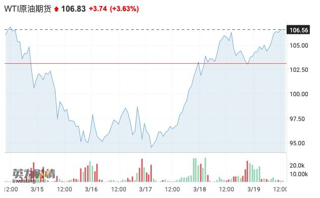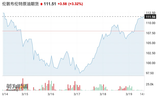 周一上午亚洲交易时段,原油期货价格上涨超过3%,截至发稿,布伦特原油涨3.32%,报111.51美元,WTI原油涨3.63%,报106.83美元。