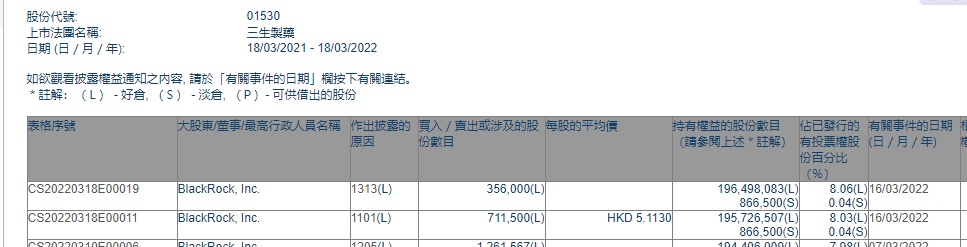 智通财经APP获悉,香港联交所最新资料显示,3月16日,贝莱德增持三生制药(01530)71.15万股,每股作价5.113港元,总金额约为363.79万港元。增持后最新持股数目约为1.96亿股,最新持股比例为8.03%。