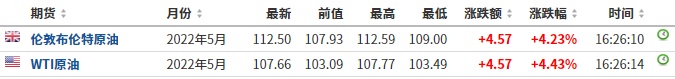 截至发稿,布伦特原油涨4.23%,报112.50美元/桶;WTI原油涨4.43%,报107.66美元/桶。