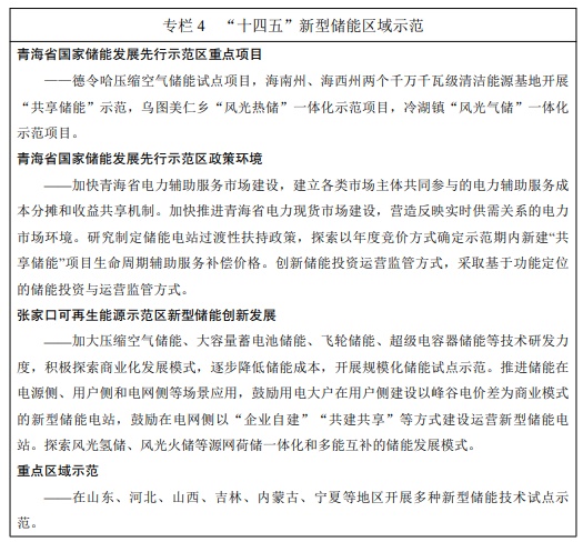 加快重点区域试点示范。积极开展区域性储能示范区建设,鼓励各地因地制宜开展新型储能政策机制改革试点,推动重点区域新型储能试点示范项目建设。结合以沙漠、戈壁、荒漠地区为重点的大型风电光伏基地建设开展新型储能试点示范;加快青海省国家储能发展先行示范区建设;加强河北、广东、福建、江苏等地首批科技创新(储能)试点示范项目跟踪评估;统筹推进张家口可再生能源示范区新型储能发展。鼓励各地在具备先进技术、人才队伍和资金支持的前提下,大胆先行先试,开展技术创新、模式创新以及体制机制创新试点示范和应用。