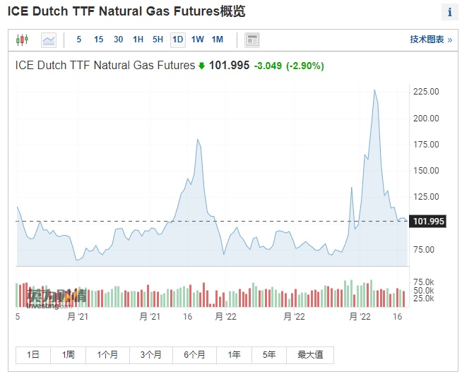 截至发稿,荷兰TTF基准天然气期货价格跌2.90%,报101.998欧元/兆瓦时。
