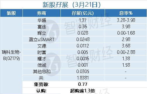智通财经APP获悉,瑞科生物-B(02179)正在招股中。截至3月21日,富途、华盛、辉立、艾德等合计为其借出孖展1.8381亿港元,认购超逾1.3倍。