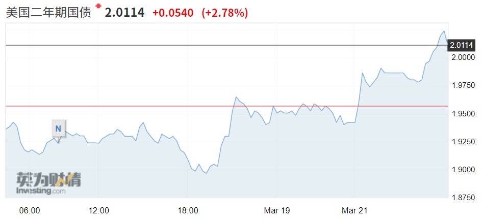 因为面对日益加剧的通胀压力,美联储和欧洲央行政策制定者的言论使市场对其加息预期升温,两年期美债收益率自2019年5月以来首次超过2%。