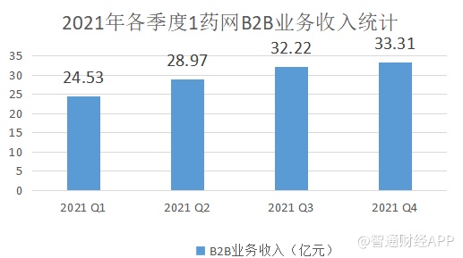 2021年第四季度时,1药网的收入为34.6亿元,同比增长30.9%,创下单季历史新高。据财报显示,整体收入持续快速增长的背后,得益于1药网核心B2B板块的强势。报告期内,B2B业务收入为33.31亿元,同比增长34.6%,成为带动1药网收入持续增长的关键推动力。