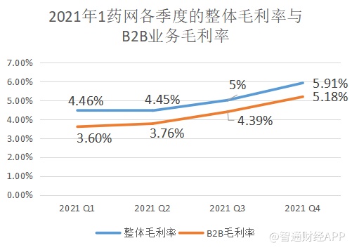 在B2B业务规模持续扩大后,平台规模效应凸显,再叠加供应链效率的不断提升,1药网B2B业务的收入成本控制能力持续改善。智通财经APP发现,2021年第一至第四季度,B2B业务的毛利率分别为3.6%、3.76%、4.39%、5.18%。得益于B2B业务毛利率的提升,1药网整体毛利率亦随之稳步增长,各季度的整体毛利率分别为4.46%、4.45%、5%、5.91%。