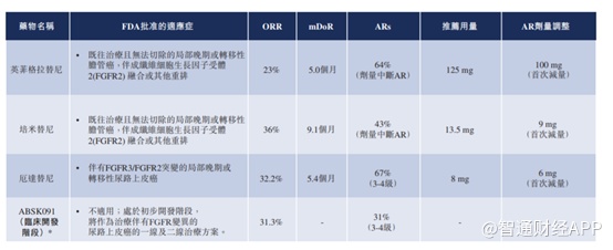 根据临床试验效果来看,在针对既往治疗有进展的晚期尿路上皮癌患者,ABSK091单药治疗组中ORR达到了31.3%,与已获批FGFR抑制剂厄达替尼的ORR相当。