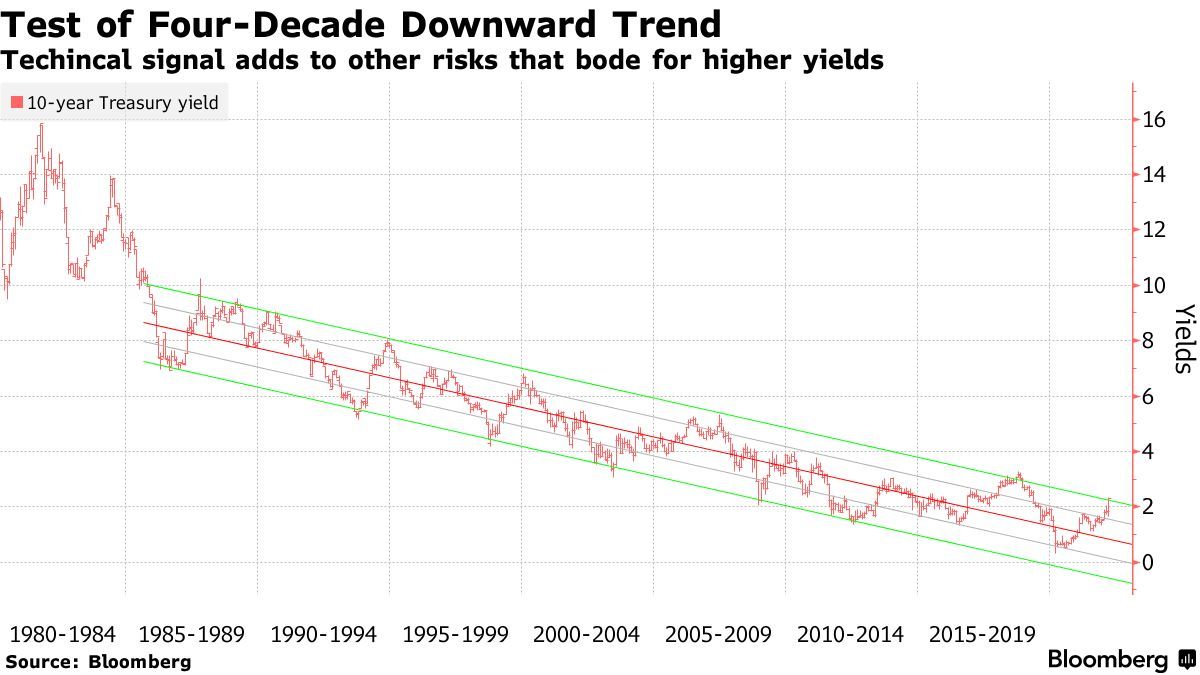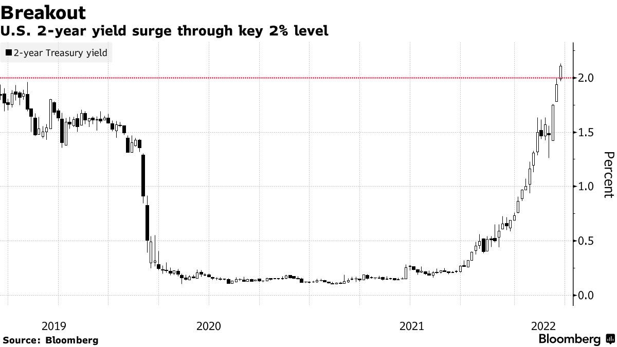 如下图所示,美国两年期国债收益率已突破2%的关键水平,自2019年5月以来首次突破这一水平,新债王”、DoubleLine Capital 创始人杰弗里·冈拉克(Jeff Gundlach)戏谑道:“2年期美债收益率在过去三周就上升86个基点,以这种速度(尽管不太可能),2年期美债收益率明年3月1日就能达到17%。”