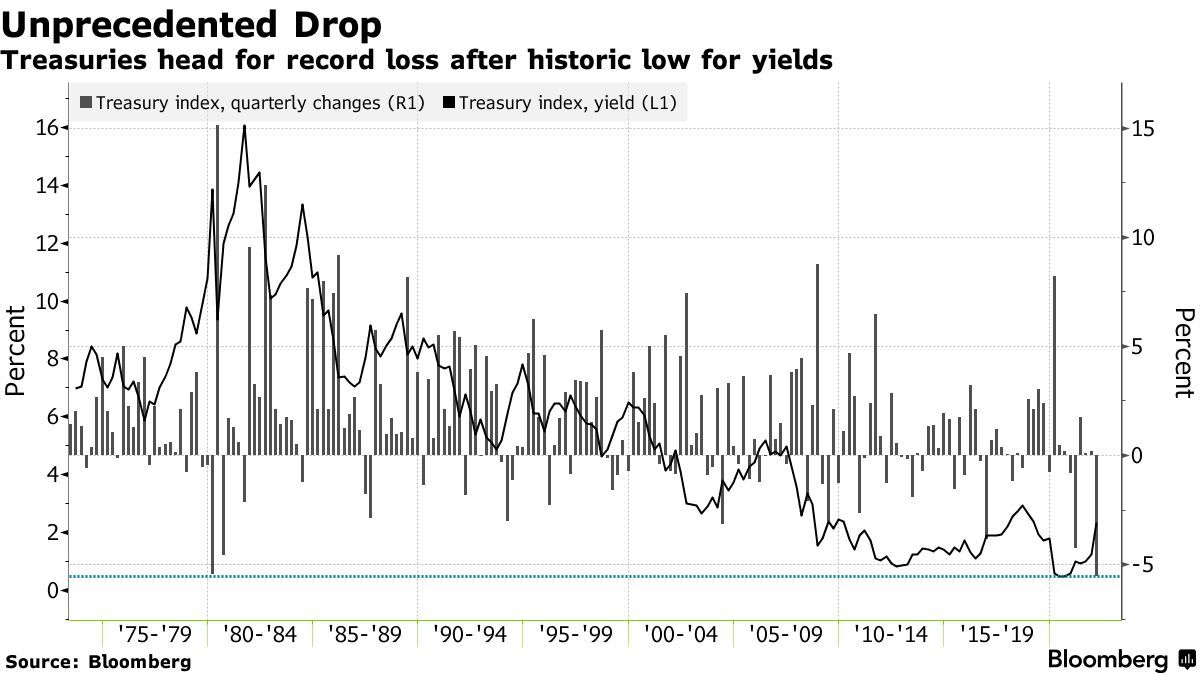 美债市场即将出现自1973年以来最严重的季度亏损,而美联储近期的举动加剧了这一局面,这反映出一些投资者可能低估了美联储为控制通胀所愿意采取紧缩措施的程度。自去年12月31日以来,Bloomberg美债指数下跌了5.55%,超过了1980年初5.45%的跌幅,这是自该指数创建以来最大的季度跌幅。
