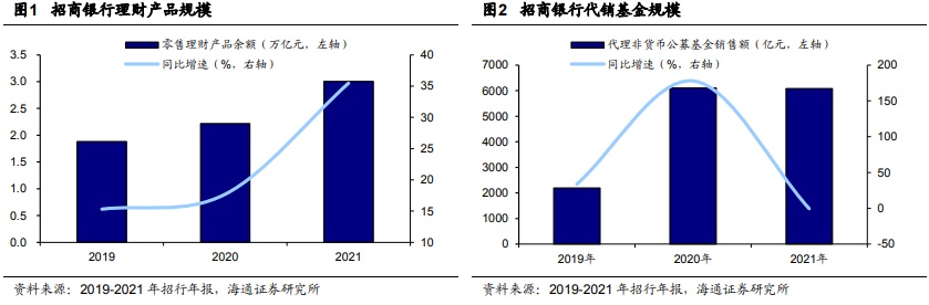 整体来看,随着我国居民理财意识的增强,财富管理行业规模快速扩张。截至2021 年末招行零售理财产品余额首次超过3万亿元,同比增长35%,增速较2020年的18%大幅提升。同时,招行近2年代销基金销售额迅速增长,2020年实现代理非货币公募基金销售额6107亿元,同比大增178%;2021年在前1年存在高基数且市场波动加大的背景 下,招行代理非货币公募基金销售额依然达到6080亿元,与2020年基本持平。