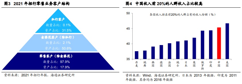 从客户数量和资产分布结构来看,2021年招行私人银行客户数量/占比为12万人/0.1%,资产规模/占比为3.4万亿元/31.5%,金葵花客户数量/占比为355万人/2.1%,资产规模/占比为5.4万亿元/50.6%,其他零售客户(除金葵花之外的零售客户,下同)数量/占比为16933万人/97.9%,资产规模/占比为1.9万亿元/17.9%。由此可见,我们居民金融资产分布呈现“金字塔型”结构,即存在明显的财富分化现象,而这也跟居民收入分化密切相关,我们在《橄榄型社会是共同体富裕核心——共同富裕系列1-20210918》中分析过当前我国高、低收入群体间可支配收入差距较大,与其他国家相比,我国收入前20%的人群收入占比较高。