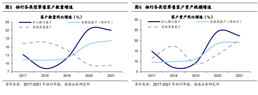 但从增长趋势来看,我们可以看到近年来我国中产阶级已经开始逐步崛起。从客户数量来看,2021年/2020年招行私人银行客户的同比增速分别为22.1%/22.4%,金葵花客户为18.3%/17.0%,其他零售客户为9.3%/9.6%;从客户资产规模来看,2021年/2020 年招行私人银行客户的同比增速分别为22.3%/24.4%,金葵花客户为19.1%/18.6%,其他零售客户为20.5%/13.3%。对比来看,尽管2021年金葵花客户数量和资产增速不及私 人银行客户,但是依然保持近年来稳步提升的态势,相反私人银行客户数量和资产的增长均出现放缓。
