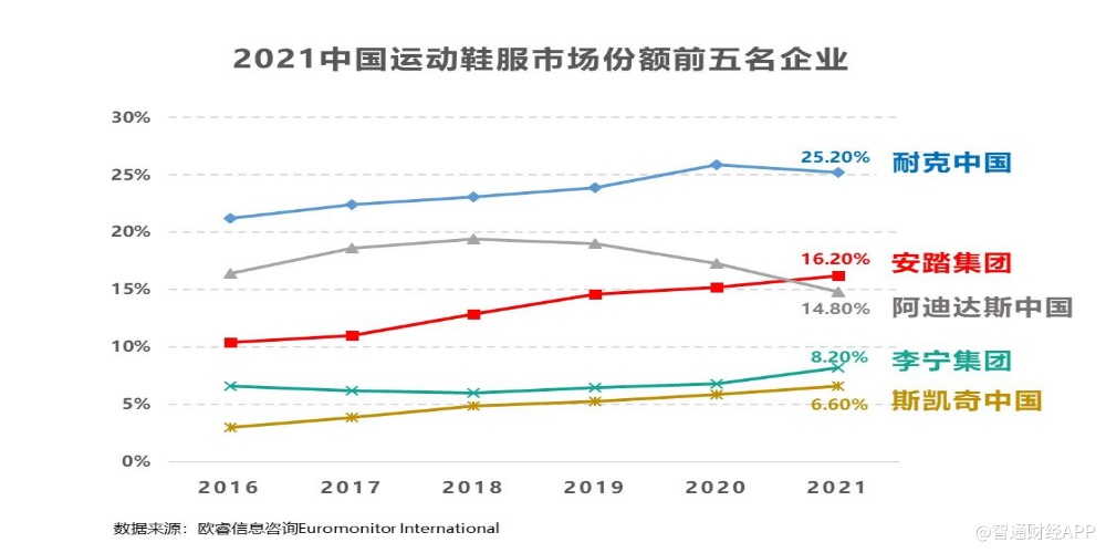 据Euromonitor数据,安踏集团2021年国内运动鞋服市场份额(市场占有率)同比上涨了1个百分点至16.2%。排名由第3位上升至第2位,超越阿迪达斯(14.8%),与耐克的差距进一步缩小。这意味着,安踏在中国市场的行业地位已经是“坐二望一”,按照目前的收入增速对比,安踏将在2022年完成对耐克的超越。