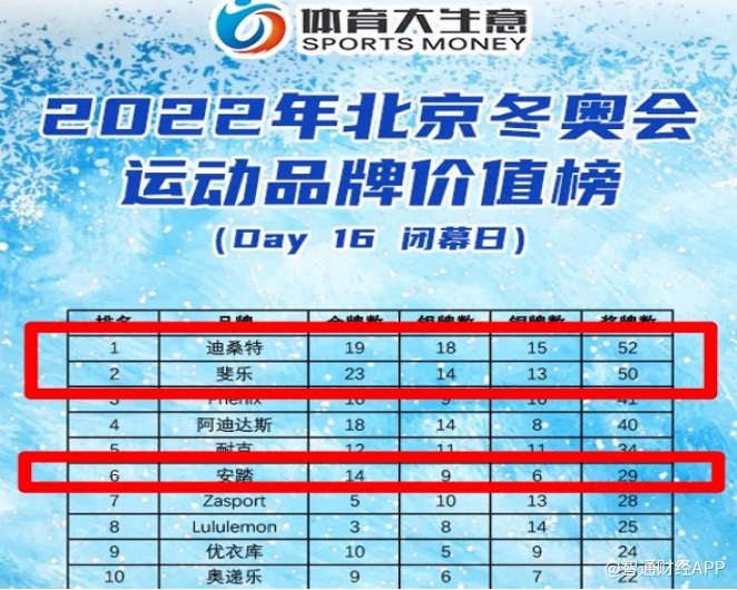 由“体育大生意”发布的“北京冬奥会运动品牌价值榜”显示,迪桑特DESCENTE及斐乐FILA分别以52枚和50枚奖牌,位居榜单前两位;安踏ANTA以29枚奖牌排名第6位。TOP10品牌中安踏集团独占三席。