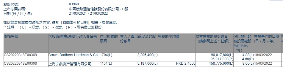 智通财经APP获悉,香港联交所最新资料显示,3月15日,上海宁泉资产管理有限公司增持中国通号(03969)518.7万股,每股作价2.45港元,总金额约为1270.82万港元。增持后最新持股数目约为1.59亿股,最新持股比例为8.06%。