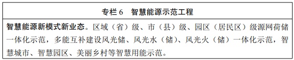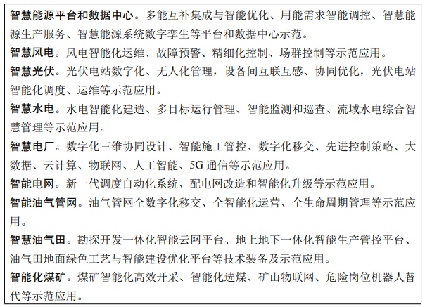 实施智慧能源示范工程。以多能互补的清洁能源基地、源网荷储一体化项目、综合能源服务、智能微网、虚拟电厂等新模式新业态为依托,开展智能调度、能效管理、负荷智能调控等智慧能源系统技术示范。推广电力设备状态检修、厂站智能运行、作业机器人替代、大数据辅助决策等技术应用,加快“智能风机”、“智能光伏”等产业创新升级和行业特色应用,推进“智慧风电”、“智慧光伏”建设,推进电站数字化与无人化管理,开展新一代调度自动化系统示范。实施煤矿系统优化工程,因地制宜开展煤矿智能化示范工程建设,建设一批少人、无人示范煤矿。加强油气智能完井工艺攻关,加快智能地震解释、智能地质建模与油藏模拟等关键场景核心技术开发与应用示范。建设能源大数据、数字化管理示范平台。