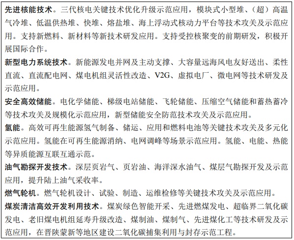 实施科技创新示范工程。依托我国能源市场空间大、工程实践机会多等优势,加大资金和政策扶持力度,重点在先进可再生能源发电和综合利用、小堆及核能综合利用、陆上常规和非常规及海洋油气高效勘探开发、燃气轮机、煤炭清洁高效开发利用等关键核心技术领域建设一批创新示范工程。瞄准新型电力系统、安全高效储能、氢能、新一代核能体系、二氧化碳捕集利用与封存、天然气水合物等前沿领域,实施一批具有前瞻性、战略性的国家重大科技示范项目。