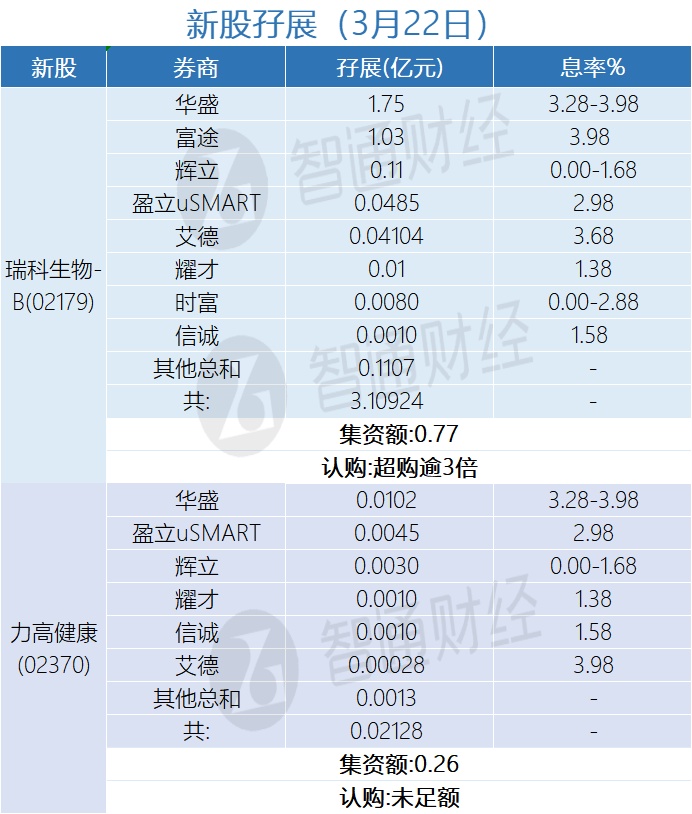智通财经APP获悉,瑞科生物-B(02179)、力高健康(02370)正在招股中。截至3月22日,富途、华盛、辉立、艾德等合计为其分别借出孖展3.10924亿港元、0.02128亿港元,瑞科生物-B超购逾3倍,力高健康认购未足额。