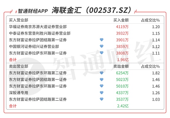 海联金汇(002537.SZ):龙虎榜阵容豪华,机构与游资产生分歧,深股通对倒净卖出1219万元,买四是知名游资赵老哥的席位买入3803万元,当日净买入841万元,该股今日反包强势涨停,预计有溢价。