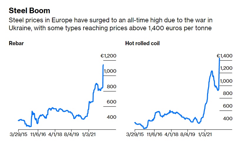 由于乌俄战争,欧洲钢铁价格飙升至历史最高水平,部分品种的价格达到每吨1400欧元以上