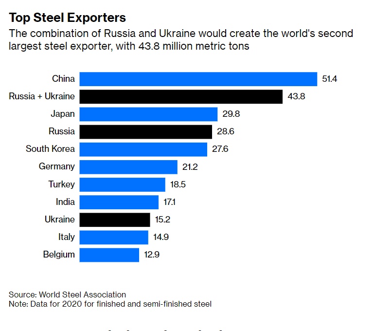 俄罗斯和乌克兰共出口4,380万吨钢铁,排在总钢铁出口量的第二名