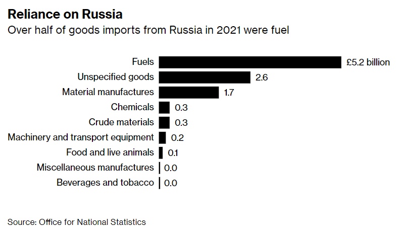 据悉,英国去年还从俄罗斯进口了价值10亿英镑的原油和10亿英镑的天然气,主要用于发电、取暖和烹饪。