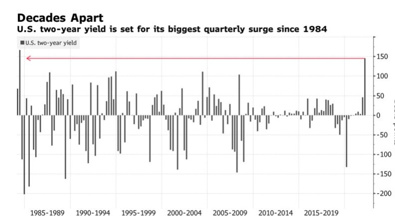 在美联储主席鲍威尔(Jerome Powell)发表激进的货币政策言论后,短期美债录得近40年来最差季度表现。智通财经APP观察到,2年期美债收益率领涨整个市场,截至发稿,2年期美债收益率上涨5个基点,至2.17%。