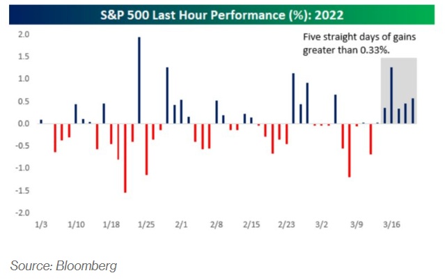 平心而论,尾盘反弹可能只是动量交易者在收盘前追逐盘中涨幅的结果。例如,ETF通常会在股市收盘前买卖股票,以便跟踪其基准指数的走势,而在市场走高时,这些基金需要增持股票。不过,对于正在寻找2022年股市暴跌结束迹象的投资者而言,连续几个交易日的强劲收盘对市场情绪的转变有着积极的影响。