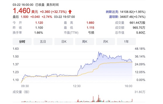 智通财经APP获悉,北京时间2022年3月22日凌晨(美国当地时间3月21日),二手车在线经销商优信集团(UXIN.US)开盘大涨,盘中涨幅一度超过50%,最终收涨32.73%,收盘报1.46美元。
