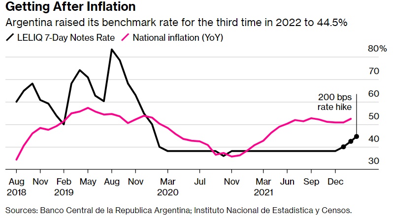阿根廷央行的政策制定者认为,实际年利率需要超过通胀率,才能符合IMF的积极利率目标。在通胀高企的情况下,阿根廷在2021年并未提高借贷成本。面对国际货币基金组织发出的收紧货币政策的呼吁,阿根廷央行今年1月份为一年多来首次上调基准利率。