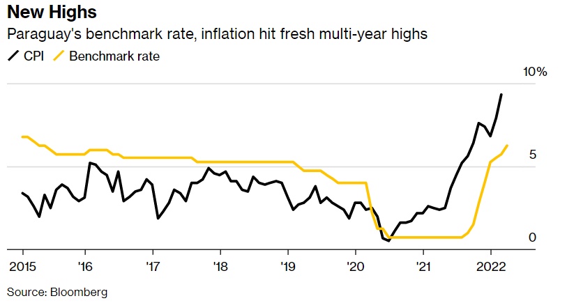同样是在当地时间周二,巴拉圭央行将基准利率提高到七年来的最高水平,以减缓目前的通货膨胀率,巴拉圭的通胀率正以10多年来最快速度攀升。在2月份加息25个基点后,该国央行再次收紧货币政策。