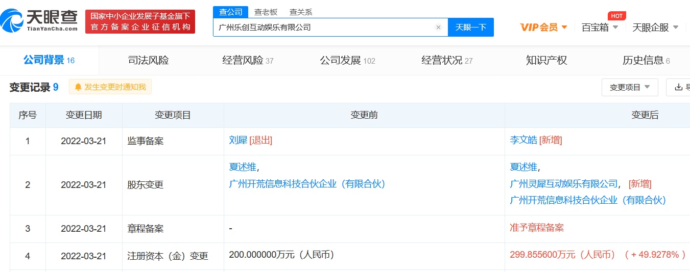 智通财经APP获悉,天眼查APP显示,广州乐创互动娱乐有限公司(下称:乐创互动娱乐)发生工商变更,新增阿里巴巴关联公司广州灵犀互动娱乐有限公司为股东,持股比例未披露。