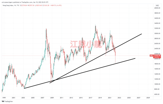 我们在月线图中,可以找到两个比较大的支撑位置,包括由2009年开始画出的上升轨道,现在约在24000点,已经大幅跌穿,而另一个支撑位在18200点左右,现在已经回探并进行反弹。那股市之后会如何?