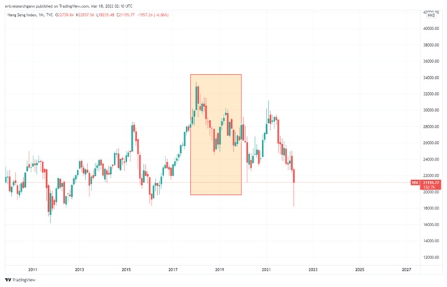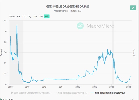 同时大家可见下图3个月Hibor的走势图表,对上一次2017年至2019年恒指下跌的时间,Hibor也同时上升,这表示资金成本上升,不利资产融资及抄卖。