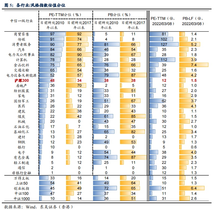 国内乐观因素更多依靠政策:降息降准、地产放松或高层召开企业家座谈会。国内滞胀困境下,短期市场很难相信今年的通胀压力会得到缓解,更多的乐观信号还是来自于政策端加码,2022年2月人民币贷款仅增1.2万亿元,企事业单位中长期贷款下滑幅度超近三年同期水平,居民户中长期贷款罕见负增长,短期贷款占比再次上升。政府工作报告提出“扩大新增信贷规模”目标,往后货币政策需要进一步加大宽松,我们认为3月降息降准均有可能,另外房地产政策也可能进一步松绑。政府工作报告提出要“提高首贷户比重”并探索新的发展模式。目前虽未出台新发展模式的具体纲要,但结合近期郭树清提到的“做好对新市民的金融服务工作”和近期各地出台的降低房贷或是降低首付比例等房地产政策措施,未来房地产政策或将进一步放松。此外今年两会特别关注减税降负支持制造业投资,如果更高层召开类似于2018年、2020年的企业家座谈会,将是明确的乐观信号,东吴策略前期报告《民企座谈会与互联网》提到,2018、2020年两次企业家座谈会后,社融增速明显企稳回升。经济的企稳回升自然需要政府积极财政扩大基建,更要四两拨千斤,增强企业与居民信心,宽货币向宽信用传导,实现全社会扩大投资再生产。