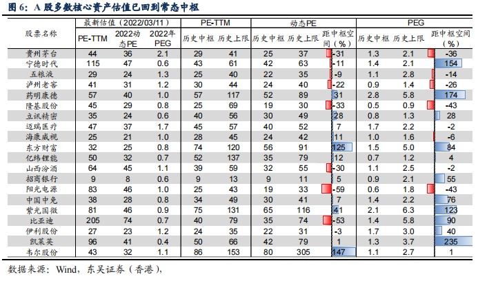 流动性覆水全收,多数核心资产估值已回到常态中枢。联储加息对核心资产估值产生下行压力,假设疫情后放松的流动性都收回,那估值应该回到此前2016-19年常态中枢(一轮完整联储货币周期及A股牛熊周期),结论是估值下行空间有限。公募前二十大重仓股2022年动态PE半数已经回到历史中枢,只有部分白酒和电新龙头估值偏贵,白酒本身凭借现金流和盈利稳定性持续获得确定性溢价,当前贵州茅台、泸州老窖动态PE较历史中枢下行空间20-30%,而新能源板块行业中长期空间打开、竞争格局优化,隆基股份、阳光电源、比亚迪较历史中枢下行空间30-60%,多数核心资产估值不贵:宁德时代2022年预测PE47倍,接近历史中枢,亿纬锂能32倍,已降至历史中枢以下。可见按照极端条件假设覆水全收,当前公募重仓股估值下行压力也已经不大。