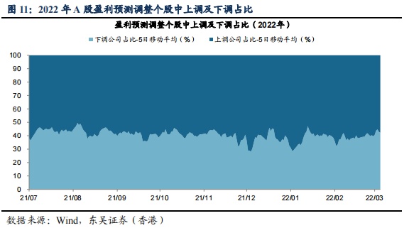 本轮杀业绩核心在于能否实现5.5%的GDP目标,目前未看到明显业绩预测下调。今年《政府工作报告》设置全年GDP增速目标5.5%,能否实现这一目标将成为决定市场后期是否会出现杀业绩的核心,近期多地疫情扩散,港股与A股急跌也在反应本轮疫情的可能冲击,若往后出现市场多数公司的业绩预期下调,对杀业绩的担忧可以适当减缓,否则还面临业绩不及预期的风险。从最近一个月来看,卖方分析师对于上市公司的盈利预测中,下调2021年盈利预测的公司占比提升明显,从春节后的45%上升到目前的70%,但对于2022年的业绩预测并未出现太大变动,密切观测已经开始的年报期,下调公司的占比变动。