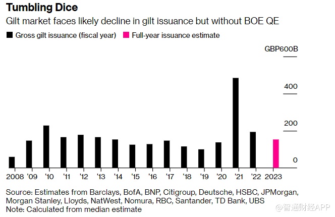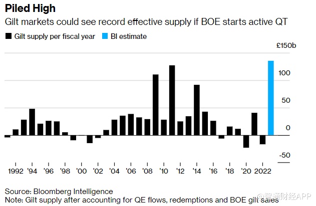 Bloomberg Intelligence估计,若总发行量为1900亿英镑,加上10月份以来每月50亿英镑的金边债券销售,市场供应将达到创纪录水平。即使英国央行没有启动QT,加拿大皇家银行资本市场估计,金边债券的有效净供应量也将达到2013-2014年以来的最高水平。