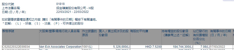 智通财经APP获悉,香港联交所最新资料显示,3月17日,Van Eck Associates Corporation增持招金矿业(01818)532.6万股,每股作价7.52港元,总金额约为4005.15万港元。增持后最新持股数目约为1.85亿股,最新持股比例为7.08%。