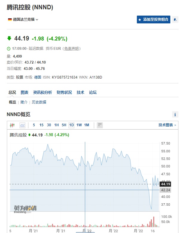 智通财经APP获悉,今日(3月23日)港股盘后,腾讯(00700)公布第四季度及全年业绩数据。数据显示,腾讯第四季度营收1441.9亿元,不及市场预期的1453.1亿元;第四季度净利润950亿元人民币,超市场预期的314.9亿元人民币。财报公布后,德国法兰克福市场上,腾讯小幅下跌,截至北京时间17:09,该股跌幅收窄至4.29%,报44.19欧元,折合约380.78港元,较港股收盘价389.00港元跌约2%。