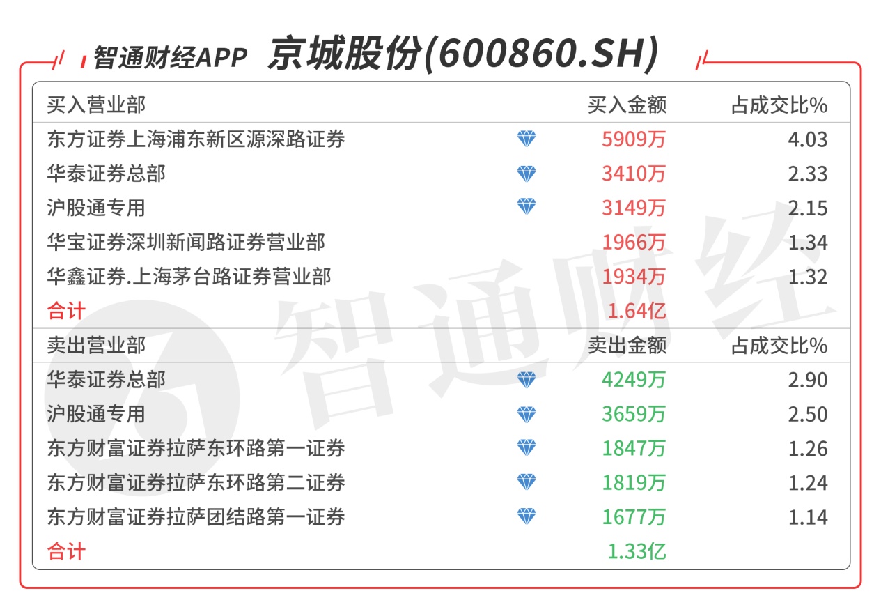 京城股份(600860.SH):龙虎榜阵容豪华,沪股通对倒,买卖均衡,买二是知名游资的席位对倒净卖出839万元,买五是知名游资炒股养家的席位买入1934万元,当日净买入3116万元,该股今日连板,一字板涨停,预计有溢价。