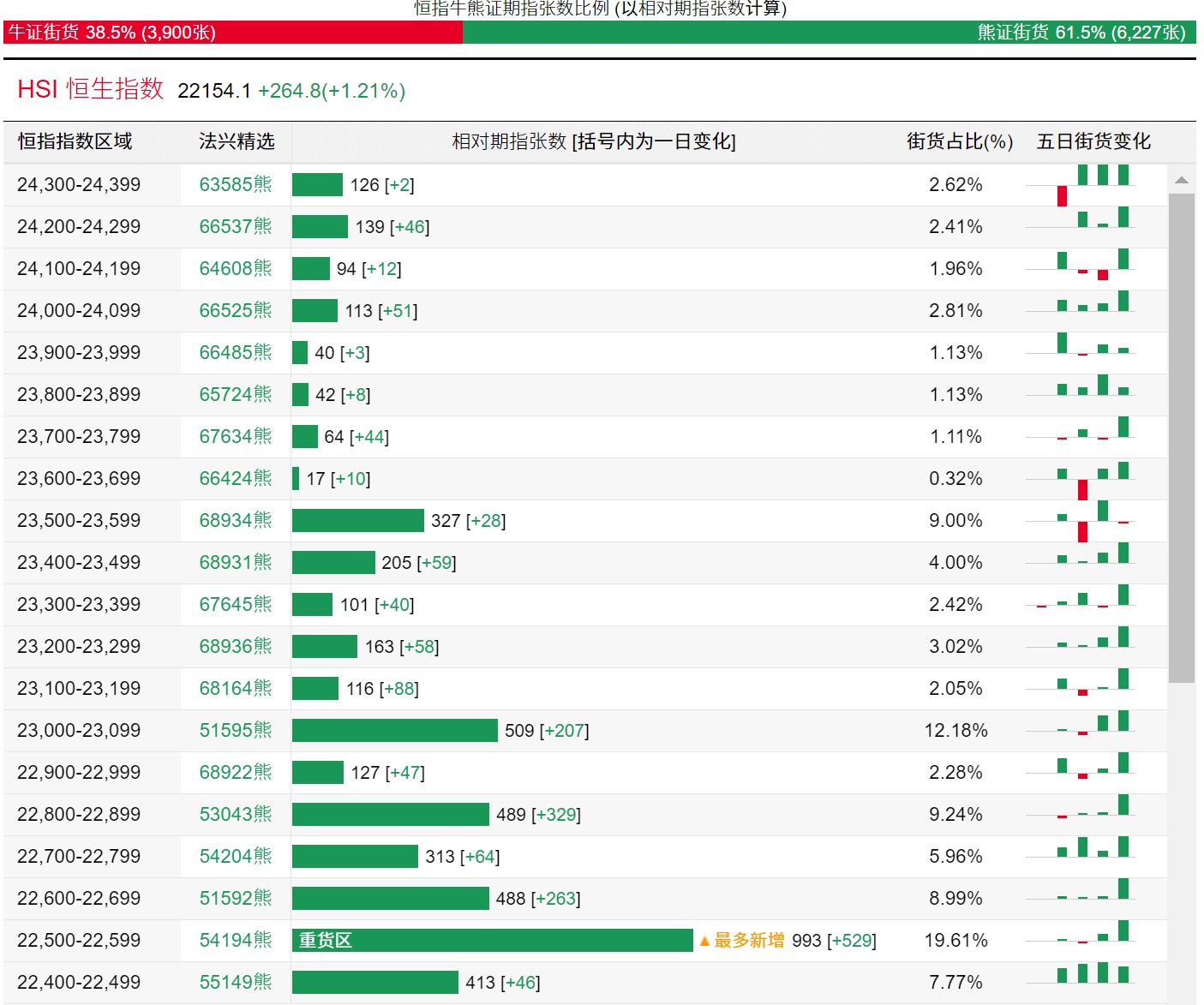 法兴恒指牛熊证街货分布图中的数据显示,熊证街货重货区和最多新增都在22500-22599区间,该区间最新熊证数量为993张,较上一交易日增加529张。