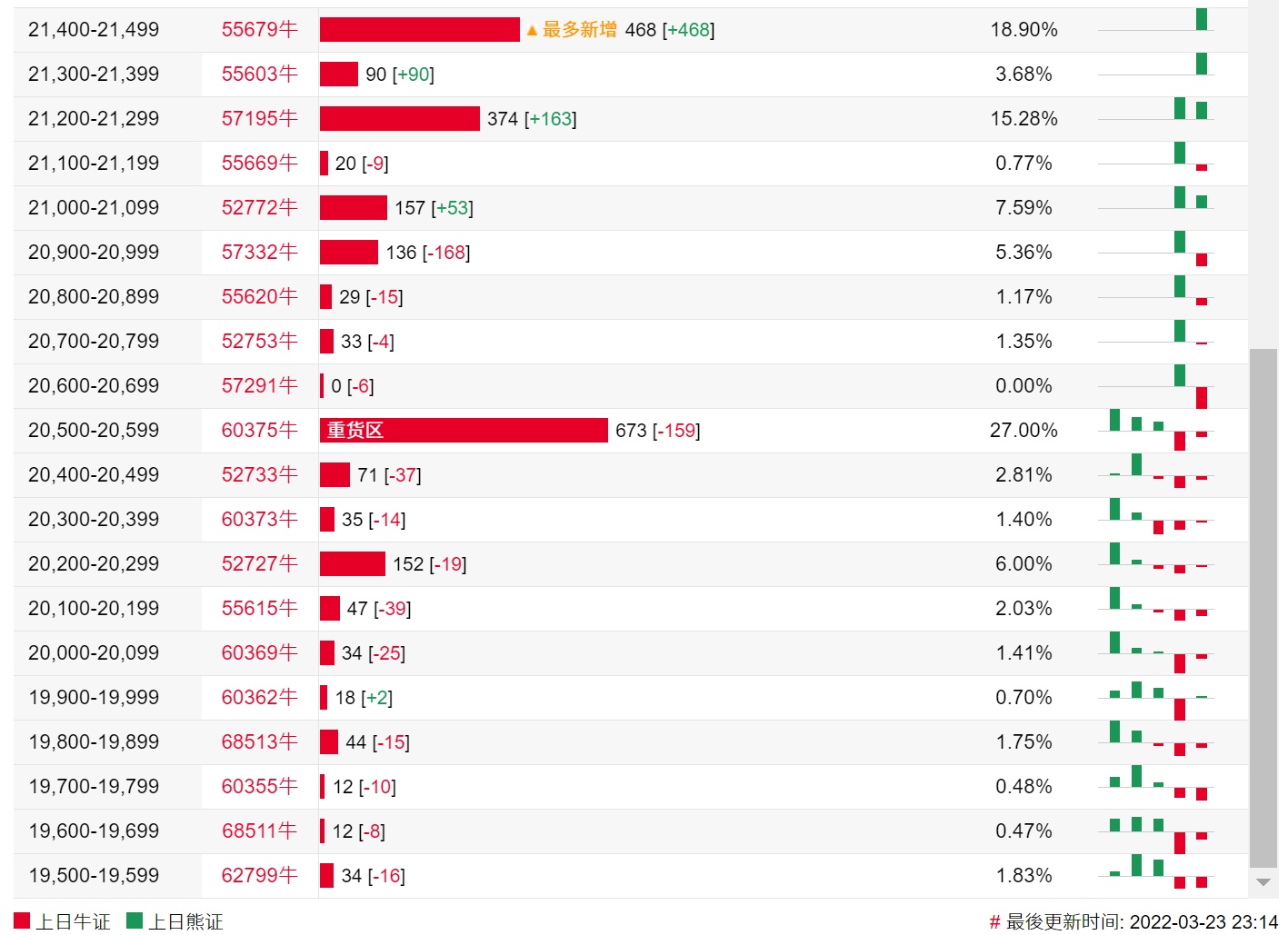 牛证街货重货区和在20500-20599区间,该区间最新牛证数量为673张,较上一交易日减少159张;最多新增在21400-21499区间,该区间最新牛证数量为468张,较上一交易日增加468张。